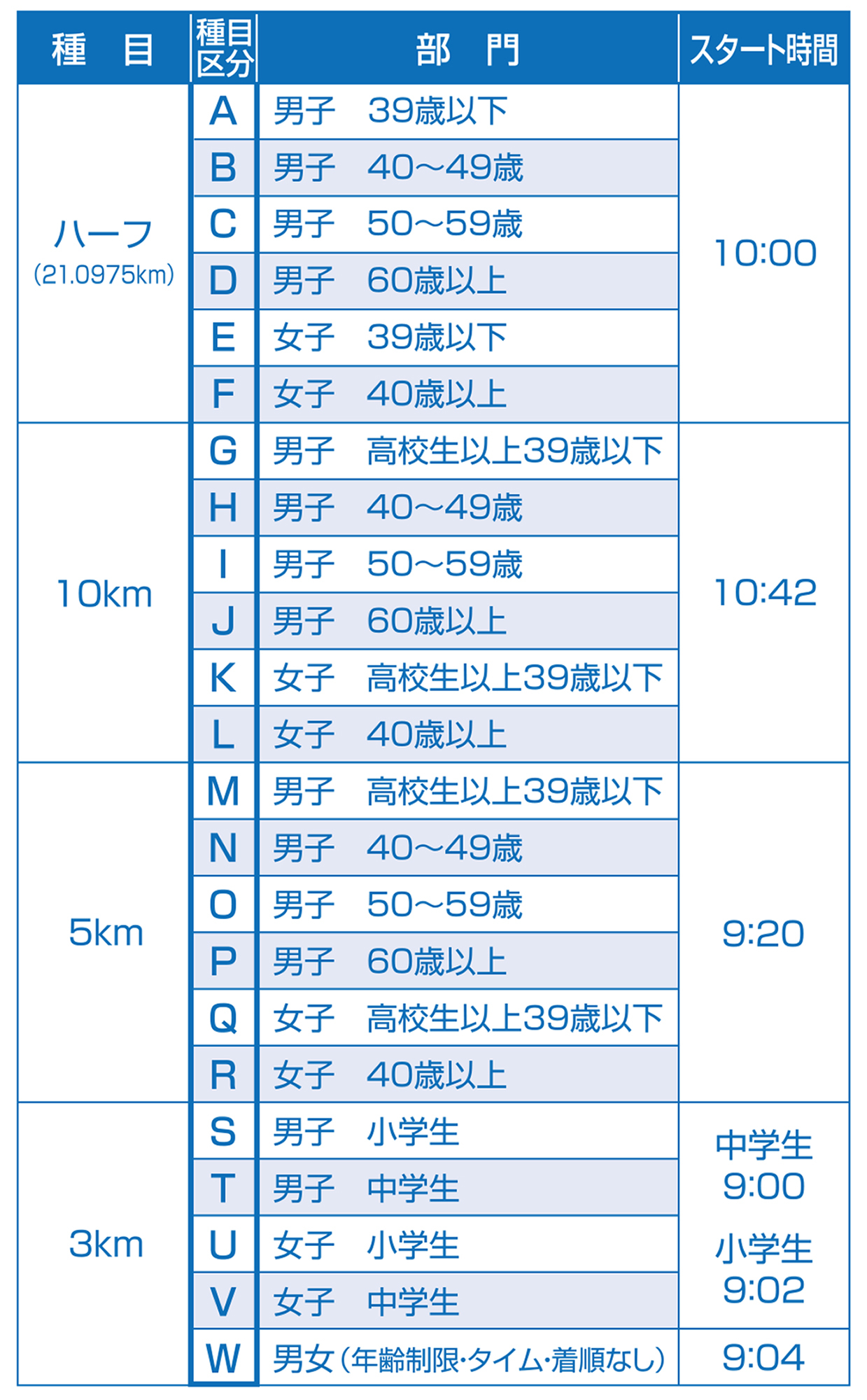 | ハーフマラソン | ハーフマラソンは2時間30分以内に完走できる方に限ります。 |